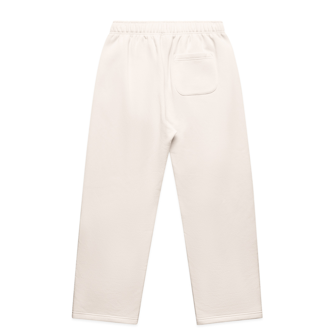 Relax cuffless joggers in mid-weight 320 GSM fabric with 80% cotton and 20% recycled polyester. Features elastic waistband, tonal drawcord, two side pockets, and one back pocket.